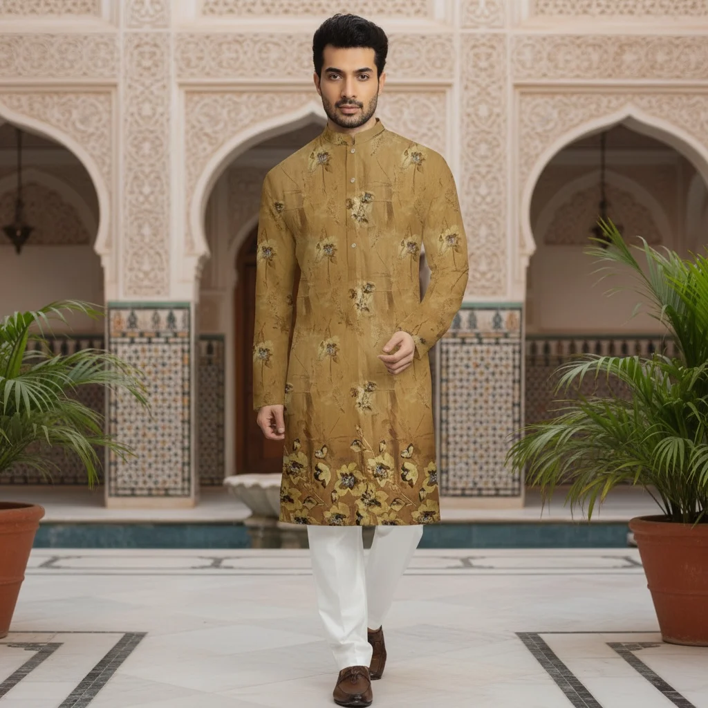 This Golden Sandstone Brown Cotton Printed Kurta Fabric features a rich earthy mustard-brown base enhanced with subtle floral artistry and deep cocoa accents. The tone reflects warmth, confidence, and refined masculinity.