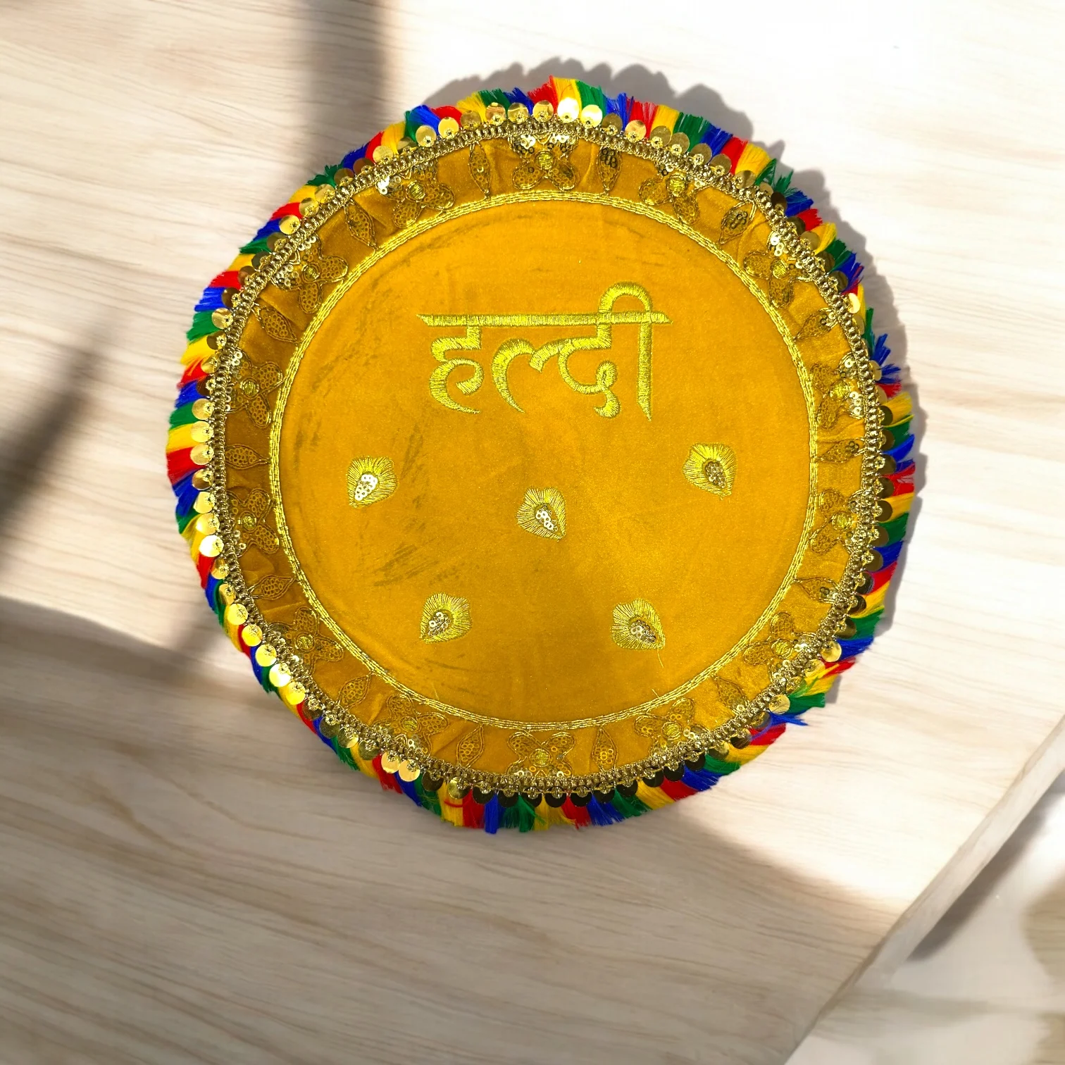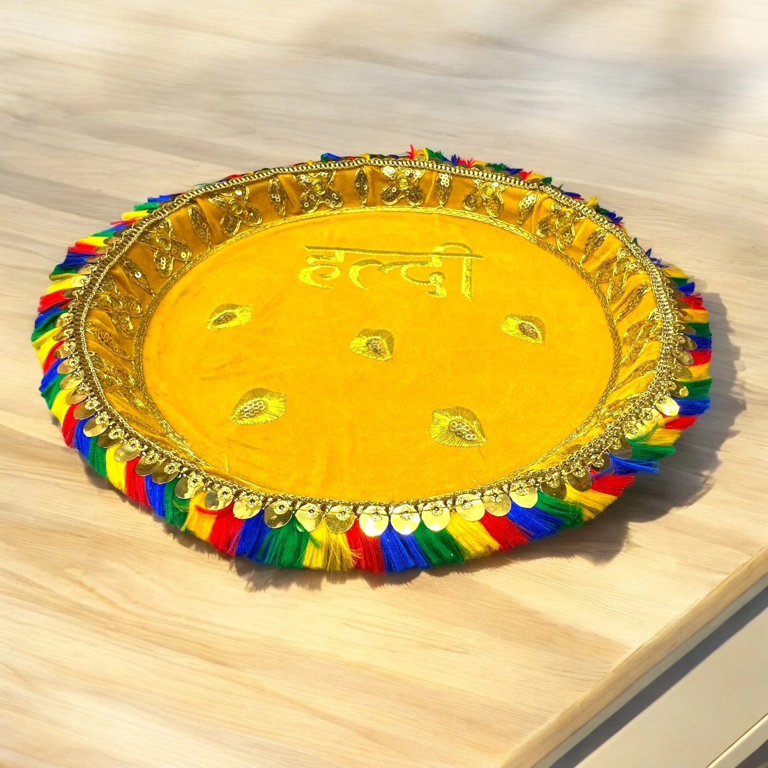 Celebrate your special moments with this exquisite Haldi Thali, designed to add a vibrant and traditional touch to your haldi ceremony. Made with a durable steel plate, adorned with soft velvet fabric, and featuring beautifully embroidered “Haldi” text, this thali is an essential part of your wedding festivities.
