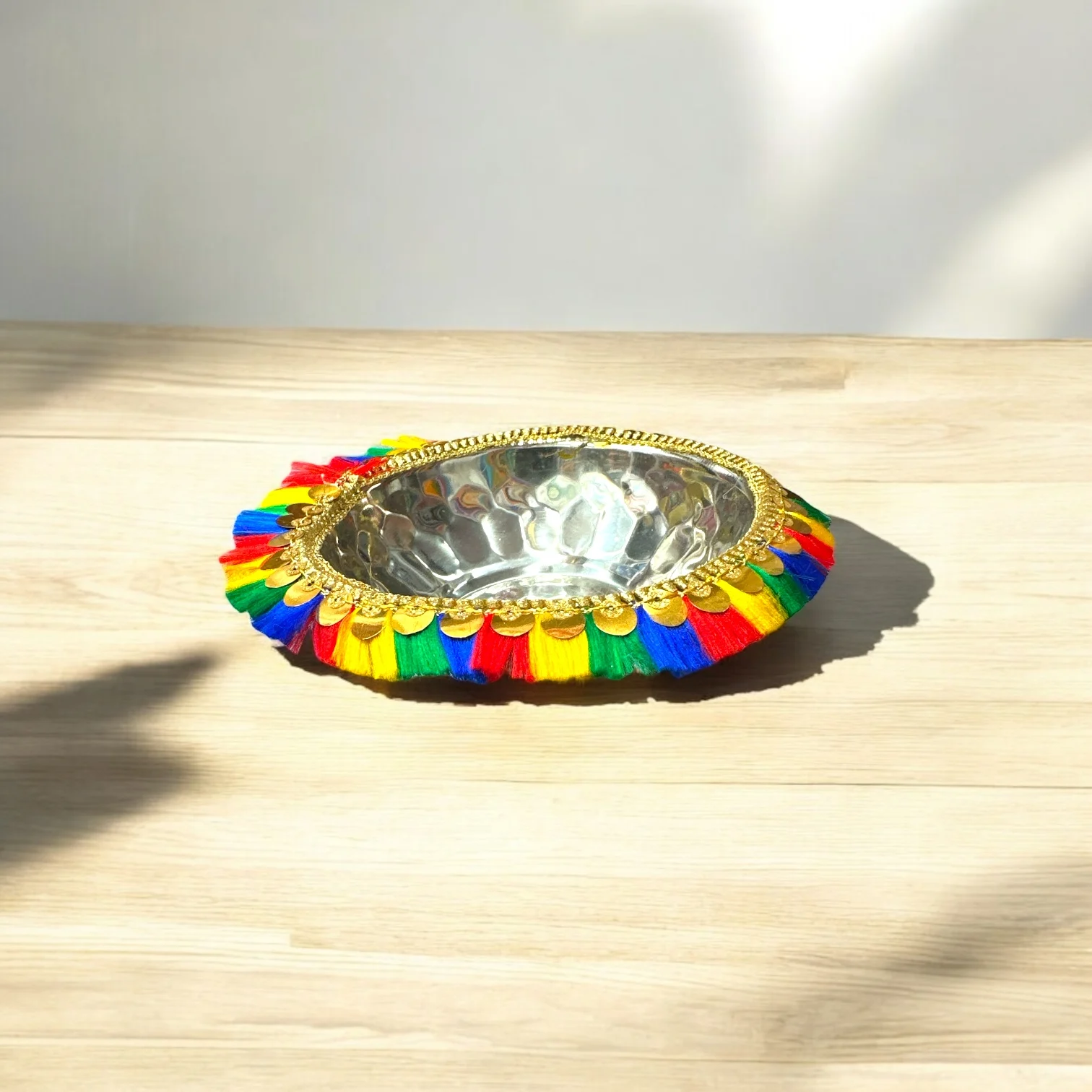 • Multi-Colored Fringe Decor: Surrounded by colorful tassels and sequins, the thali enhances the festive vibe of your ceremonies.
