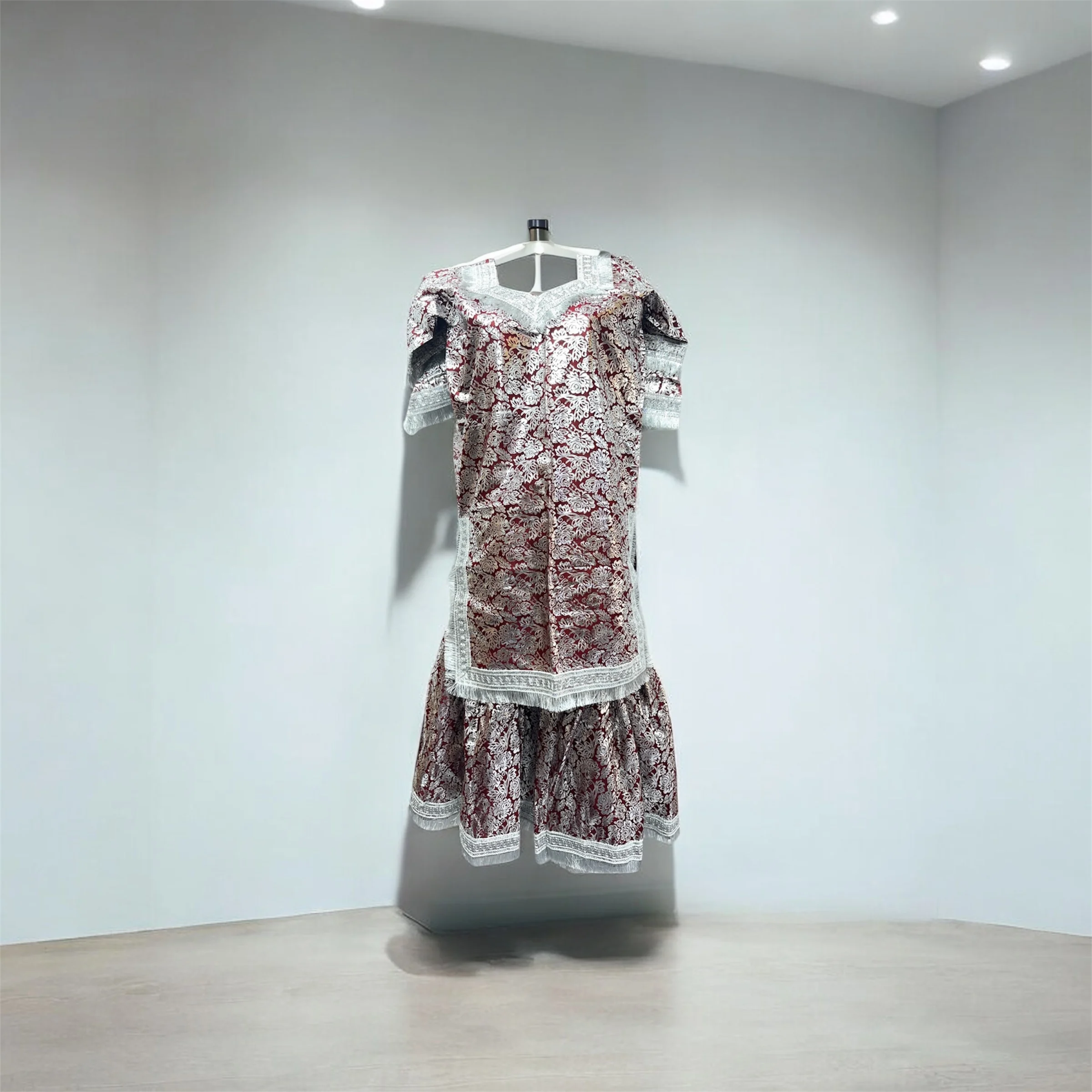 • Design: Lavish floral prints spread beautifully across the burgundy background, complemented by delicate silver trimmings that highlight the neckline, sleeves, and hem, adding a touch of glamour.