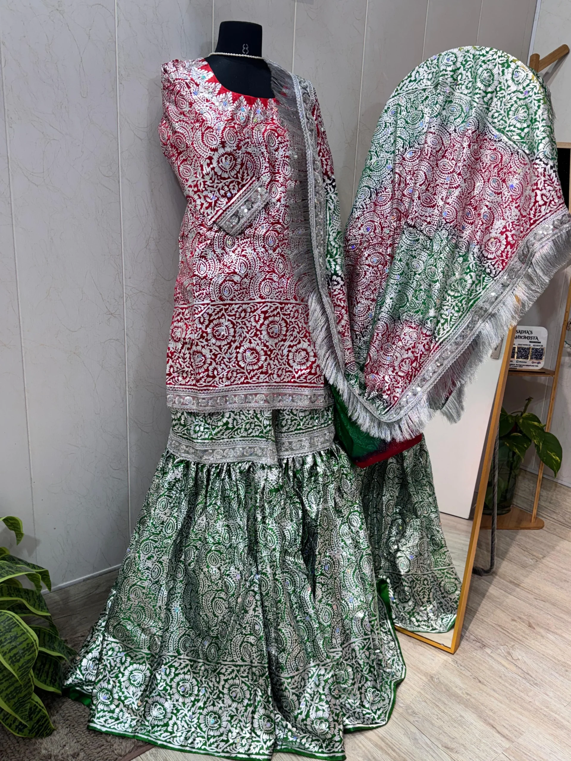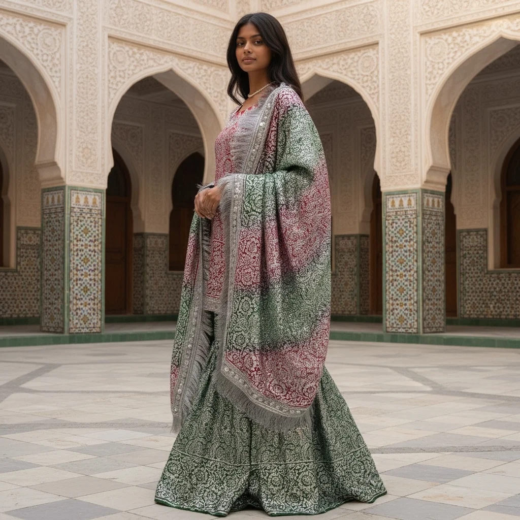 Our Traditional Dual-Tone Bihari Gharara is a tribute to the timeless craftsmanship of Bihar. This ensemble features the classic “Shahana” silhouette, characterised by its dramatic flare and regal presence. The striking combination of red and green satin silk creates a bold, festive look that is perfect for Nikah, weddings, and heirloom collections.
