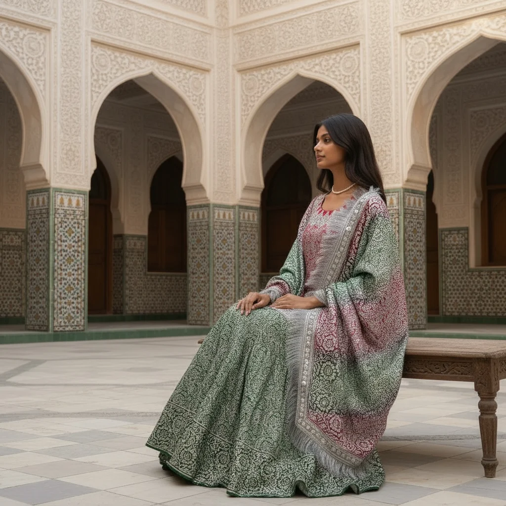 • Hand-Finished Borders: The joints and hemlines are adorned with silver Zari Laces, while the dupatta and ghera are finished with Zari Kiran, providing that signature rhythmic movement known to traditional ghararas.