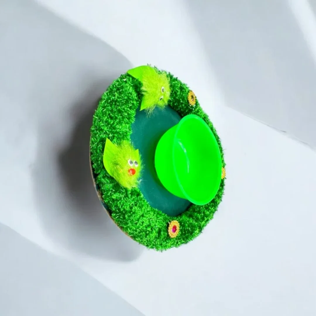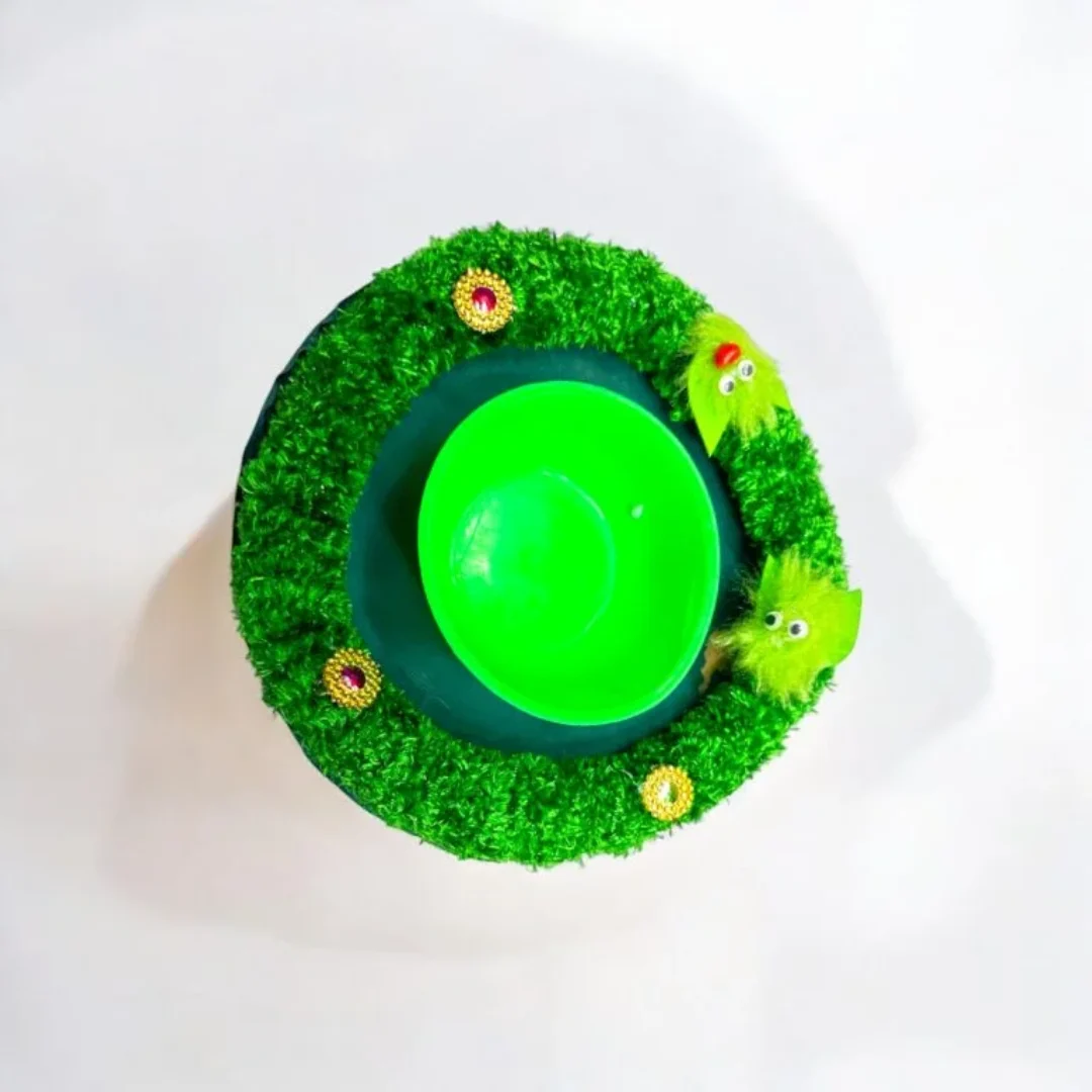 • Decoration: The thali is adorned with lush artificial grass, enhancing its aesthetic appeal. The grass is complemented by colorful embellishments and miniature craft items that add a festive and cultural touch, capturing the essence of traditional celebrations.