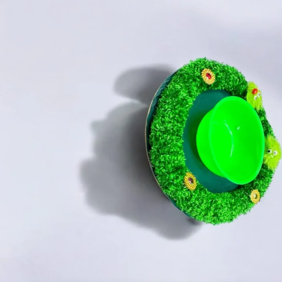 • Central Bowl: It features a prominent green bowl at the center, which serves as a container for Mehandi or other ceremonial items. The bowl’s bright color stands out against the grass, making it both functional and decorative.